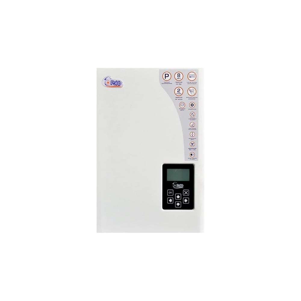 Электрокотел РЭКО 8 кВт, 220/380В 8П - отопительный агрегат, оснащенный ЖК-дисплеем, на котором предусмотрены все необходимые индикации (информация о текущих температурах, режимах работы и неисправностях). В качестве теплоносителя для котла можно использовать воду или бытовой антифриз. Возможно использование котла с системами теплого пола. Диапазон регулирования температуры воздуха от 5 до 35 °С.
