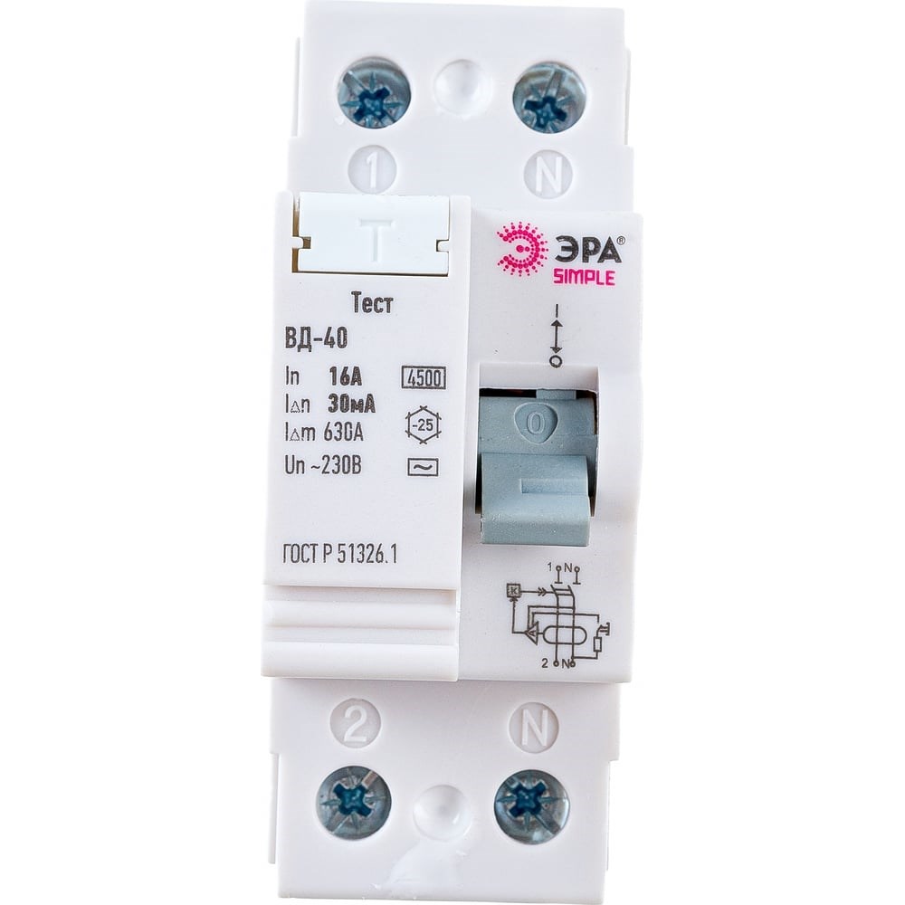 Устройство защитного отключения ЭРА SIMPLE УЗО ВД-40 2P 16А/30мА электронное Б0039261