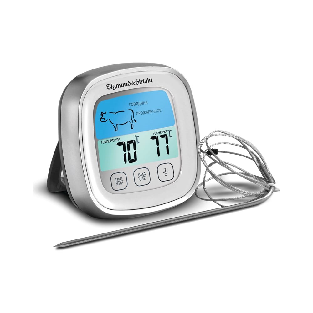 Термощуп - устройство, которым легко измерить температуру блюда благодаря металлическому наконечнику, похожему на иглу. Его обычно используют для приготовления стейка, барбекю, запекания птицы, говядины и всех прочих мясных блюд. Но на этом его применение не ограничивается. Тремощуп станет отличным помощником для замера температуры детского питания, напитков и выпечки. Данная модель имеет встроенный таймер до 100 минут, который издает звуковой сигнал, когда блюдо достигает необходимой температуры или закончится время. Термощуп Zigmund & Shtain Kuchen-Profi MP-60 W имеет 8 встроенных автоматических программ для приготовления блюд из любого вида мяса, а также пять степеней прожарки: с кровью, слабая прожарка, средняя прожарка, почти прожаренное, прожаренное. Выбрать температуру и время приготовления можно на ручном режиме для индивидуальных случаев.