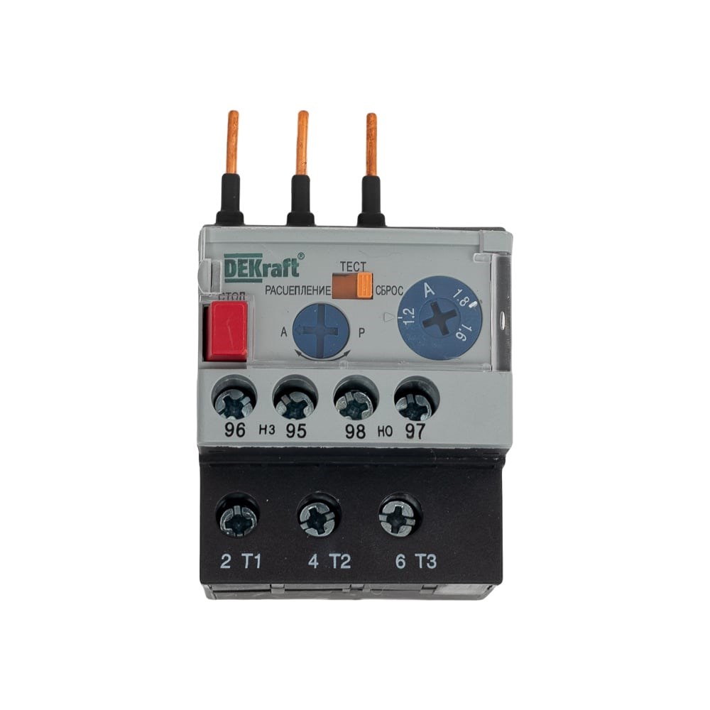 Тепловое реле РТ-03 09-18А 1.20-1.80А DEKraft 23108DEK 1113715 предназначается для обеспечения надежной защиты цепей переменного тока и электродвигателей. Устройство препятствует возникновению перегрузок, асимметрии фаз, затянутого пуска и заклиниванию ротора. Тепловое реле перегрузки можно устанавливать непосредственно в сочетании с контактором или без него на специальное основание ОС-03.