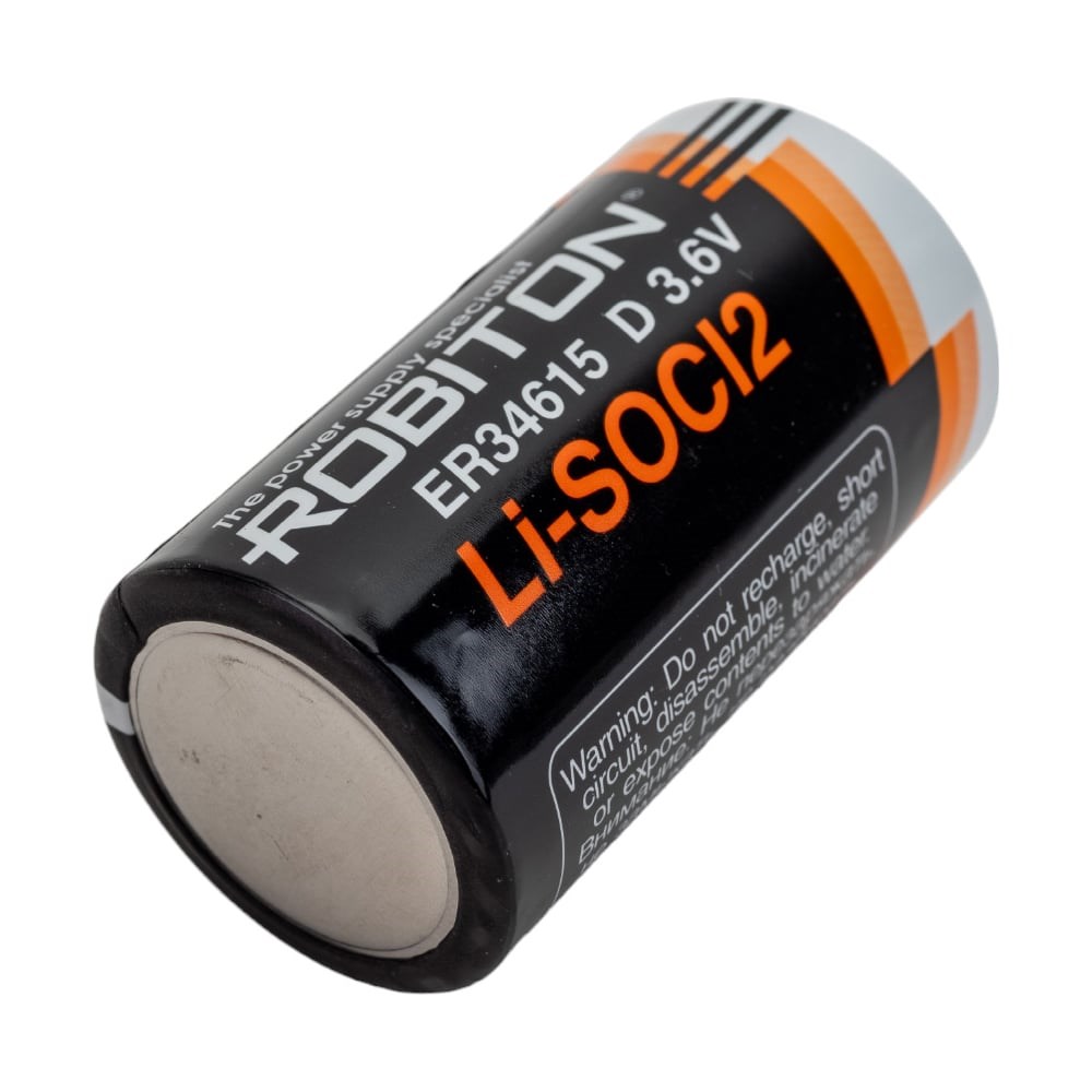 Элемент питания Robiton ER34615- D 11618 неперезаряжаемый литий-тионилхлоридный (LiSOCl2) элемент питания размера ER34615 бобинного типа. Элементы питания ROBITON серии ER специально разработаны для долговременной работы с малым потреблением тока и предназначены для основного автономного питания газо, водо и электросчётчиков, накопителей CMOS, систем ночного видения, датчиков охранно-пожарных сигнализаций, банкоматов, торговых автоматов, морского и навигационного оборудования и т.д. Номинальная емкость: 19000мАч (разряд током 3,0мА до 2В). Максимальный постоянный ток разряда: 200мА. Максимальный импульсный ток разряда: 400мА. Номинальный размер: 61,5х34мм. Диапазон рабочих температур: от -55°С до +85°С. Саморазряд не более 1% в год при температуре +21°С. Срок хранения при соблюдении условий: не менее 10 лет. После хранения обязательна депассивация током 75мА в течение 40 минут для выхода на рабочее напряжение.
