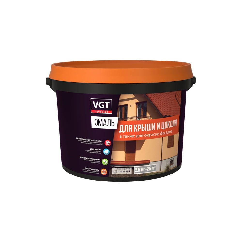 Эмаль для крыши и цоколя VGT (супербелая; полуглянцевая; 2,5 кг) 11607617 - высококачественное покрытие для крыш, черепицы, цоколя. Обладает высокой адгезией к бетону, кирпичу, штукатурке, шиферу, крышам с минеральным покрытием и древесине. Для фасадных и внутренних работ Долговечная Обладает высокой стойкостью к атмосферным воздействиям Защищают покрытие от появления плесени и грибков Образует “дышащее” покрытие Водо- и светостойкая Класс истирания (DIN EN13300): Класс 1 (<5 мкм при 200 циклах истирания) Плотность:1.1-1.2 г/см³ Время высыхания: до отлипа – 2 часа, полное высыхание через 24 часа при температуре (20±3)°С и относительной влажности воздуха (65±5)% Расход: 100 г/м² при одинарном нанесении Полный набор прочности и устойчивость к влажной уборке достигается через 2 недели Рабочая поверхность должна быть сухой и чистой. Рекомендуется предварительное грунтование поверхности грунтовкой глубокого проникновения Способ нанесения: эмаль наносится кистью, валиком или краскопультом. Рекомендуется нанесение двух и более слоев эмали с промежуточной сушкой 2 часа. При необходимости снижения вязкости добавить не более 5% воды.