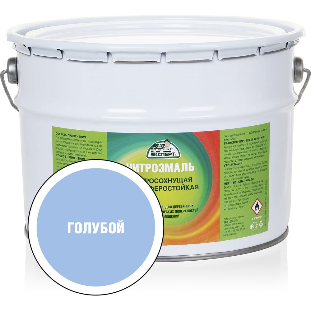 Эмаль Эксперт НЦ-132 голубая, 8 кг 31168 применяется для окрашивания деревянных, оштукатуренных и металлических поверхностей, изделий и оборудования снаружи и внутри помещений. Благодаря составу, продукт образует атмосферостойкое, глянцевое покрытие. При температуре воздуха от 18 до 22 градусов время высыхания каждого слоя 1 час.