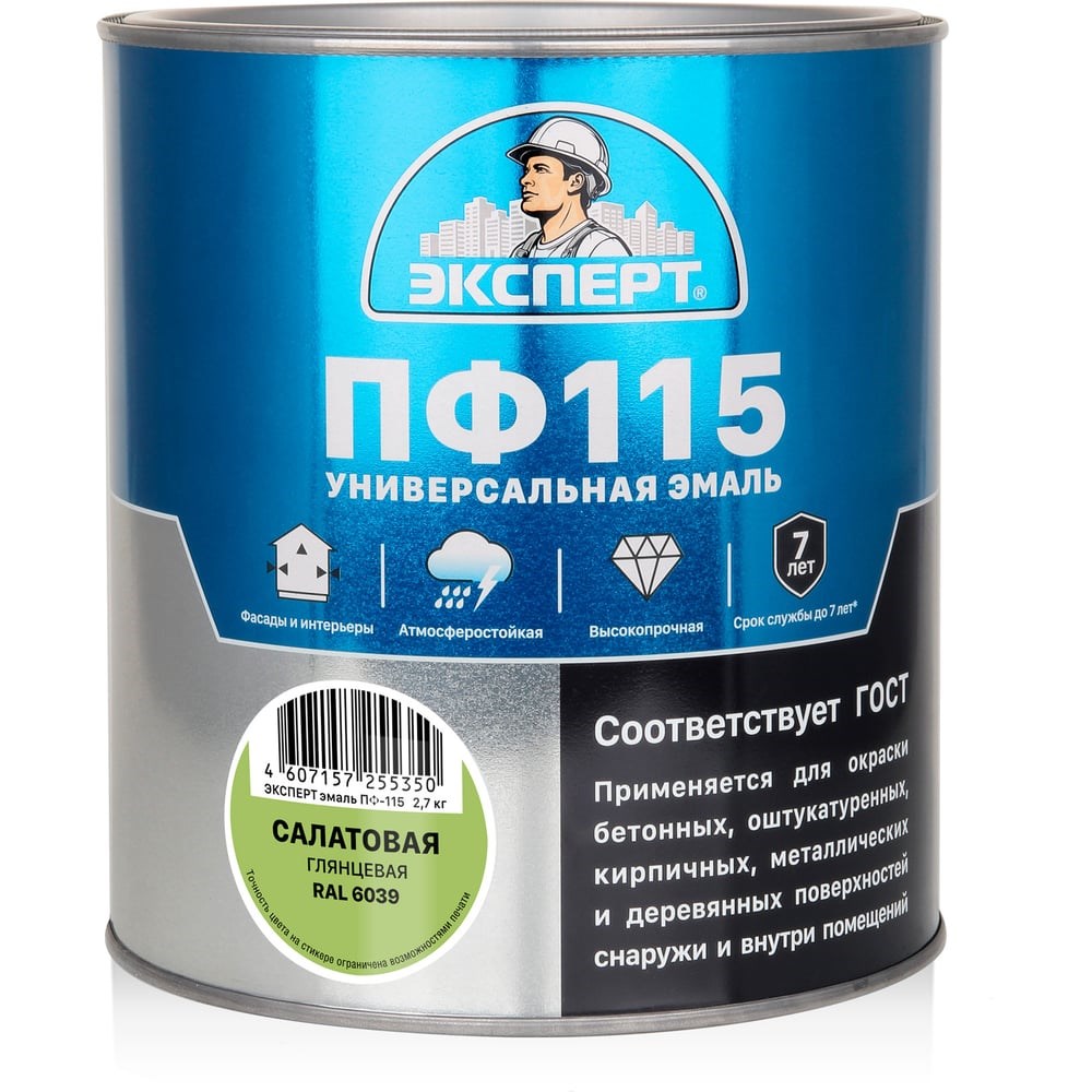 Эмаль ЭКСПЕРТ ПФ-115 глянцевая, салатовая, 2.7 кг 34103 применяется для защитно-декоративного окрашивания металлических, деревянных и минеральных поверхностей снаружи и внутри помещений. Продукт используют для обработки дверей, рам, перил, наличников, плинтусов, оград, механизмов и конструкций.Благодаря составу, средство образует глянцевое покрытие стойкое к вредным факторам окружающей среды.Производится в соответствии ГОСТу 6465-76.Способ нанесения:Поверхность должна быть прочной, чистой и сухой. С металлических основ удалить рыхлую ржавчину, окалины и обезжирить растворителем, рекомендуют предварительно загрунтовать антикоррозионным грунтом ГФ 021. Эмаль распределяют кистью, валиком или краскопультом в 2 слоя. При температуре от 18 до 22 градусов время высыхания каждого слоя 24 часа.