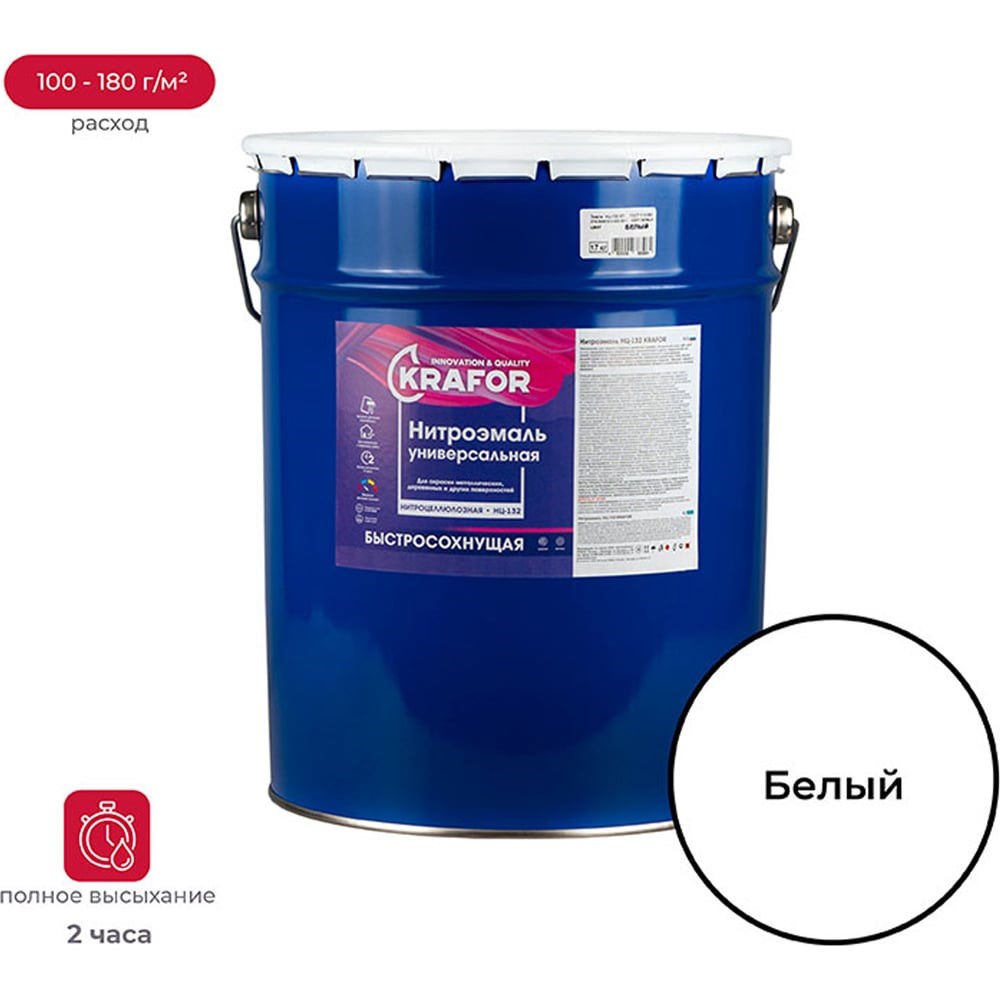 Предназначена для защиты и окраски древесных (дерево, натуральный шпон, ДВП, ДСП и т.п.), предварительно загрунтованных металлических и других поверхностей или ранее окрашенных поверхностей изделий, подвергающихся атмосферным воздействиям и/или эксплуатируемых внутри помещений зданий всех типов. Высыхание: 2 часа; Расход: 100 - 180 г/м² на однослойное покрытие в зависимости от цвета и способа нанесения; Разбавитель: растворитель №646 (ГОСТ 18188-2020) или ксилол; Срок годности: 365 дней. Белый Нитроэмаль быстросохнущая НЦ-132 Быстро сохнет. Образует атмосферо-, свето- и водостойкое твердое, эластичное покрытие. После высыхания не оказывает вредного воздействия на организм человека. Перед применением необходимо тщательно перемешать, в случае необходимости разбавить растворителем №646, сделанным только по ГОСТ 18188-2020 или использовать ксилол.
