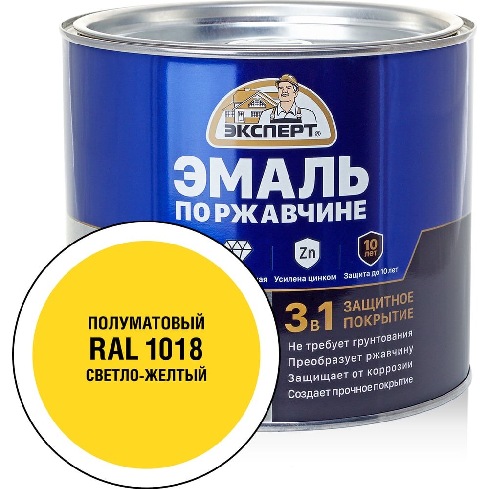 Эмаль ЭКСПЕРТ по ржавчине 3 в 1 полуматовая, светло-желтый RAL 1018, 1.8 кг 28258 применяется для защитно-декоративного окрашивания металлических, деревянных, бетонных и железобетонных конструкций без предварительного грунтования. Состав объединяет свойства 3 продуктов: преобразователя ржавчины, антикоррозионного грунта и декоративной эмали. Используют для внутренних и наружных работ. Способ нанесения: Поверхность предварительно очистить от пыли, рыхлой ржавчины, загрязнений и обезжирить. При окрашивании алюминиевых, оцинкованных или гальванизированных основ предварительно используют грунтовку для цветных металлов. Наносят состав в два слоя кистью, валиком или методом распыления. При температуре 20 градусов и 65 % относительной влажности воздуха эмаль высыхает примерно через 2-4 часа. Повторное нанесение средства допускается через 24 часа. При соблюдении правил нанесения покрытие обеспечивает защиту металла до 10 лет.