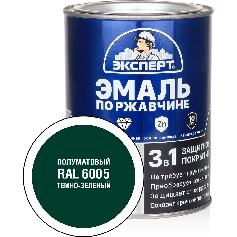 Эмаль по ржавчине 3в1 полуматовая ЭКСПЕРТ темно-зеленый RAL 6005 0,8 кг 28328 - атмосферостойкая алкидная эмаль по ржавчине для окраски металлических поверхностей снаружи и внутри помещений без предварительного грунтования. Можно наносить на прокорродировавшую поверхность после удаления рыхлой ржавчины. Способ нанесения: Поверхность предварительно очистить от пыли, рыхлой ржавчины, загрязнений и обезжирить. При окрашивании алюминиевых, оцинкованных или гальванизированных основ предварительно используют грунтовку для цветных металлов. Наносят состав в два слоя кистью, валиком или методом распыления. При температуре 20 градусов и 65 % относительной влажности воздуха эмаль высыхает примерно через 2-4 часа. Повторное нанесение средства допускается через 24 часа. При соблюдении правил нанесения покрытие обеспечивает защиту металла до 10 лет.