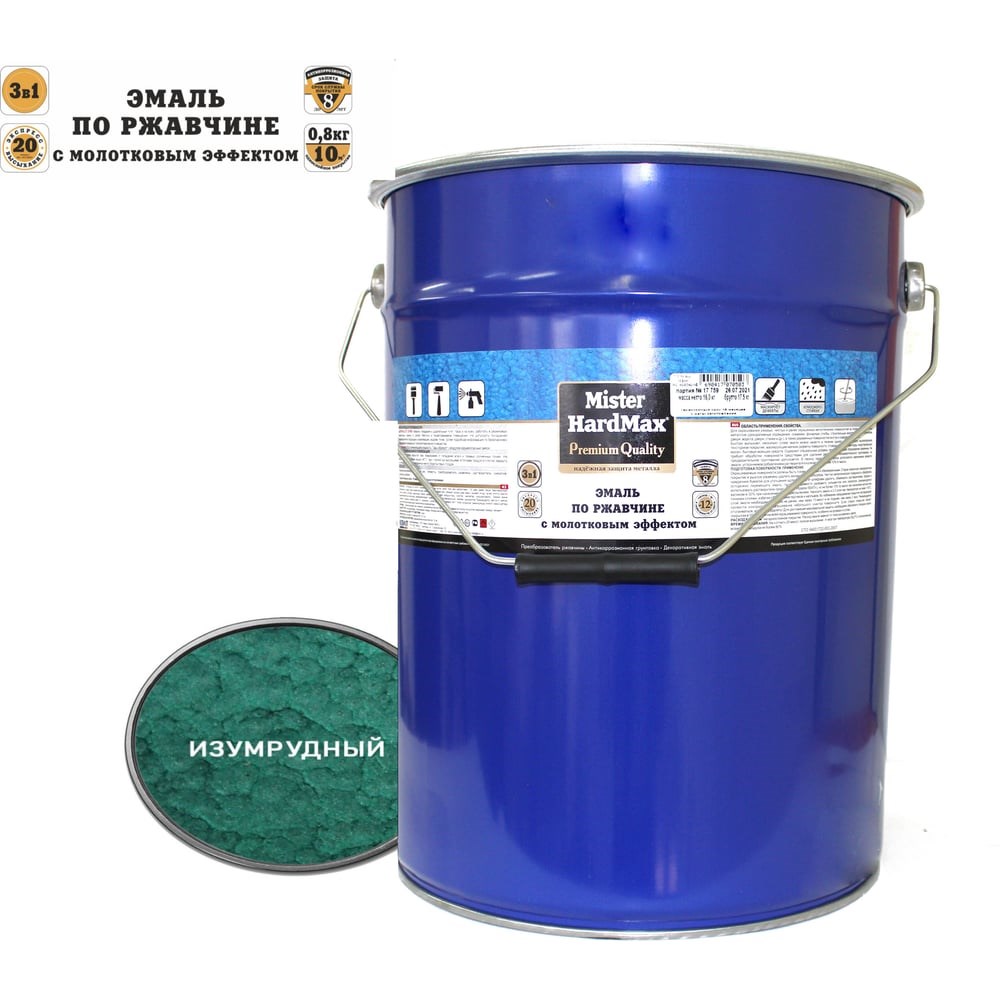 Эмаль по ржавчине с молотковым эффектом HardMax изумрудная, барабан 16 кг 4690417070206 служит для одновременного преобразования ржавчины, антикоррозионного грунтования, финишной окраски чистых и прокорродировавших металлических поверхностей (с толщиной прочно связанной с металлом ржавчины до 80 мкм). Используют для обработки промышленного оборудования, дверей, ворот, ограждений, корпусов видео- и аудиоаппаратуры (кинопроекторы, телескопы), банковской техники, изделий художественной ковки, металлической мебели (стеллажи, шкафы, сейфы). Состав образует рисунчатое (молотковое) покрытие, маскирующее мелкие дефекты поверхности. Своеобразный фактурный слой подчеркивает красоту изделий ручной работы. Продукт обладает высокой атмосферостойкостью, повышенной влаго- и противокоррозионной стойкостью. Применение эмали упрощает подготовку основания перед окрашиванием и удешевляет технологию создания антикоррозионного покрытия, т.к. не требует предварительного удаления прочно связанной ржавчины и грунтования. Срок службы покрытия не менее 8 лет.