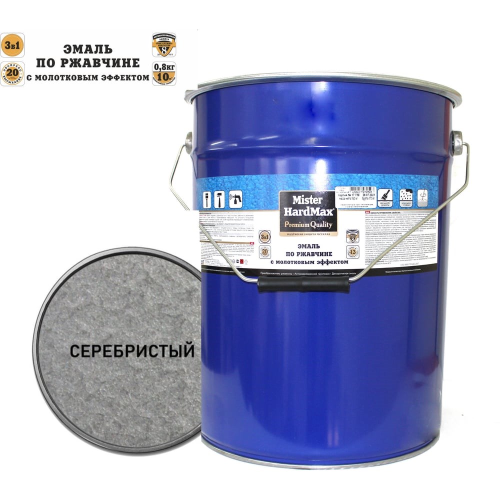 Эмаль по ржавчине с молотковым эффектом HardMax серебристая, барабан 16 кг 4690417070473 служит для одновременного преобразования ржавчины, антикоррозионного грунтования, финишной окраски чистых и прокорродировавших металлических поверхностей (с толщиной прочно связанной с металлом ржавчины до 80 мкм). Используют для обработки промышленного оборудования, дверей, ворот, ограждений, корпусов видео- и аудиоаппаратуры (кинопроекторы, телескопы), банковской техники, изделий художественной ковки, металлической мебели (стеллажи, шкафы, сейфы). Состав образует рисунчатое (молотковое) покрытие, маскирующее мелкие дефекты поверхности. Своеобразный фактурный слой подчеркивает красоту изделий ручной работы. Продукт обладает высокой атмосферостойкостью, повышенной влаго- и противокоррозионной стойкостью. Применение эмали упрощает подготовку основания перед окрашиванием и удешевляет технологию создания антикоррозионного покрытия, т.к. не требует предварительного удаления прочно связанной ржавчины и грунтования. Срок службы покрытия не менее 8 лет.