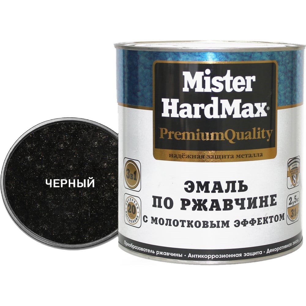 Эмаль по ржавчине с молотковым эффектом HardMax черная, банка 2,5 кг, 1 шт. 4690417070589 служит для одновременного преобразования ржавчины, антикоррозионного грунтования, финишной окраски чистых и прокорродировавших металлических поверхностей (с толщиной прочно связанной с металлом ржавчины до 80 мкм). Используют для обработки промышленного оборудования, дверей, ворот, ограждений, корпусов видео- и аудиоаппаратуры (кинопроекторы, телескопы), банковской техники, изделий художественной ковки, металлической мебели (стеллажи, шкафы, сейфы). Состав образует рисунчатое (молотковое) покрытие, маскирующее мелкие дефекты поверхности. Своеобразный фактурный слой подчеркивает красоту изделий ручной работы. Продукт обладает высокой атмосферостойкостью, повышенной влаго- и противокоррозионной стойкостью. Применение эмали упрощает подготовку основания перед окрашиванием и удешевляет технологию создания антикоррозионного покрытия, т.к. не требует предварительного удаления прочно связанной ржавчины и грунтования. Срок службы покрытия не менее 8 лет.