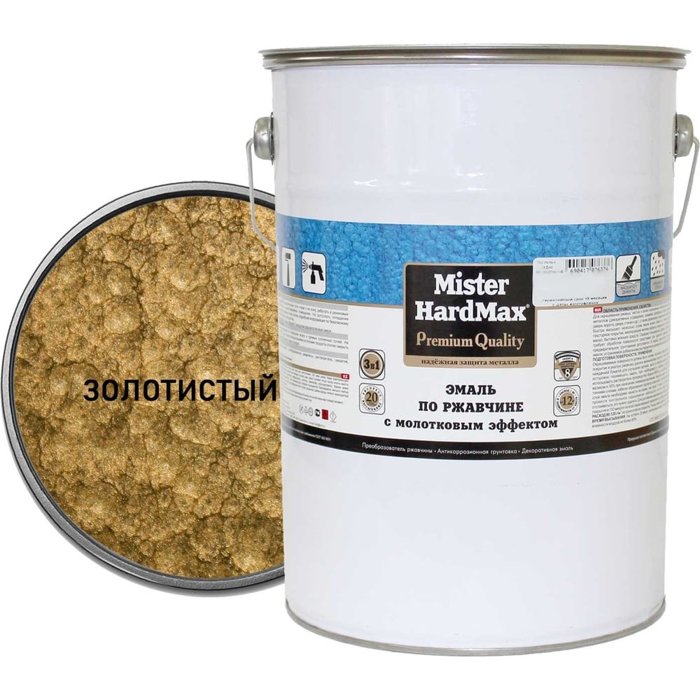 Эмаль по ржавчине с молотковым эффектом HardMax золотистая, барабан 5 кг, 1 шт. 4690417076215 служит для одновременного преобразования ржавчины, антикоррозионного грунтования, финишной окраски чистых и прокорродировавших металлических поверхностей (с толщиной прочно связанной с металлом ржавчины до 80 мкм). Используют для обработки промышленного оборудования, дверей, ворот, ограждений, корпусов видео- и аудиоаппаратуры (кинопроекторы, телескопы), банковской техники, изделий художественной ковки, металлической мебели (стеллажи, шкафы, сейфы). Состав образует рисунчатое (молотковое) покрытие, маскирующее мелкие дефекты поверхности. Своеобразный фактурный слой подчеркивает красоту изделий ручной работы. Продукт обладает высокой атмосферостойкостью, повышенной влаго- и противокоррозионной стойкостью. Применение эмали упрощает подготовку основания перед окрашиванием и удешевляет технологию создания антикоррозионного покрытия, т.к. не требует предварительного удаления прочно связанной ржавчины и грунтования. Срок службы покрытия не менее 8 лет.