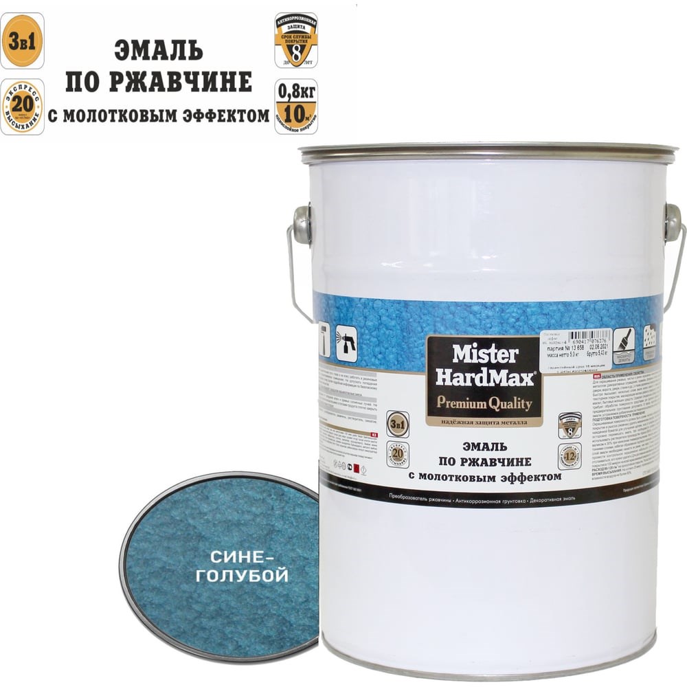 Эмаль по ржавчине с молотковым эффектом HardMax сине-голубая, барабан 5 кг, 1 шт. 4690417076345 служит для одновременного преобразования ржавчины, антикоррозионного грунтования, финишной окраски чистых и прокорродировавших металлических поверхностей (с толщиной прочно связанной с металлом ржавчины до 80 мкм). Используют для обработки промышленного оборудования, дверей, ворот, ограждений, корпусов видео- и аудиоаппаратуры (кинопроекторы, телескопы), банковской техники, изделий художественной ковки, металлической мебели (стеллажи, шкафы, сейфы). Состав образует рисунчатое (молотковое) покрытие, маскирующее мелкие дефекты поверхности. Своеобразный фактурный слой подчеркивает красоту изделий ручной работы. Продукт обладает высокой атмосферостойкостью, повышенной влаго- и противокоррозионной стойкостью. Применение эмали упрощает подготовку основания перед окрашиванием и удешевляет технологию создания антикоррозионного покрытия, т.к. не требует предварительного удаления прочно связанной ржавчины и грунтования. Срок службы покрытия не менее 8 лет.