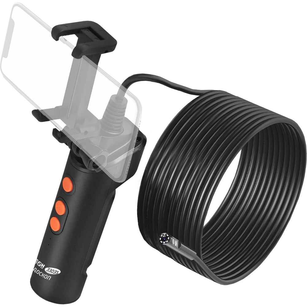 Эндоскоп МЕГЕОН 33035 к0000035620 представляет собой рукоятку с зондом и держателем для мобильного устройства связи. При помощи Wi–Fi можно передать изображение мобильному устройству на платформе Android и IOS. Необходимое приложение доступно для скачивания без ограничения в Play Market и APP Store. Имеется возможность работать с большим количеством мобильных устройств. Размер изображения зависит только от диагонали экрана личного смартфона или планшета. Конструкция захвата позволяет свободно удерживать гаджет шириной до 73 мм, но это не мешает держать более габаритный аппарат в руках, так как передачу данный обеспечивает дистанционная связь. Видеонаблюдение осуществляется с двух пыле- влагозащищенных камер – фронтальной и боковой. Яркая светодиодная подсветка высокой интенсивности гарантирует прекрасную видимость в полном отсутствии освещения. Полужесткий зонд встроен в рукоятку и не имеет разъемного соединения.