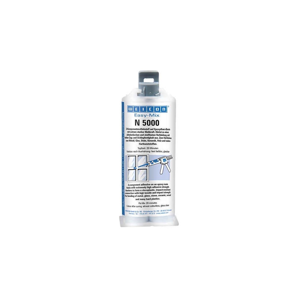 Эпоксидный клей WEICON Easy Mix N 5000 затвердевающий за 20 минут, прозрачный, 50 мл wcn10650250 предназначен для заполнения пустот, трещин и зазоров, соединения деталей, монтажа и ремонта различных изделий. Двухкомпонентный состав на основе эпоксидной смолы и отвердителя не содержит растворителей. Продукт обладает устойчивостью к механическим нагрузкам (сжатие, скручивание, сдвиг), воздействию влаги, масел и агрессивных химических сред.