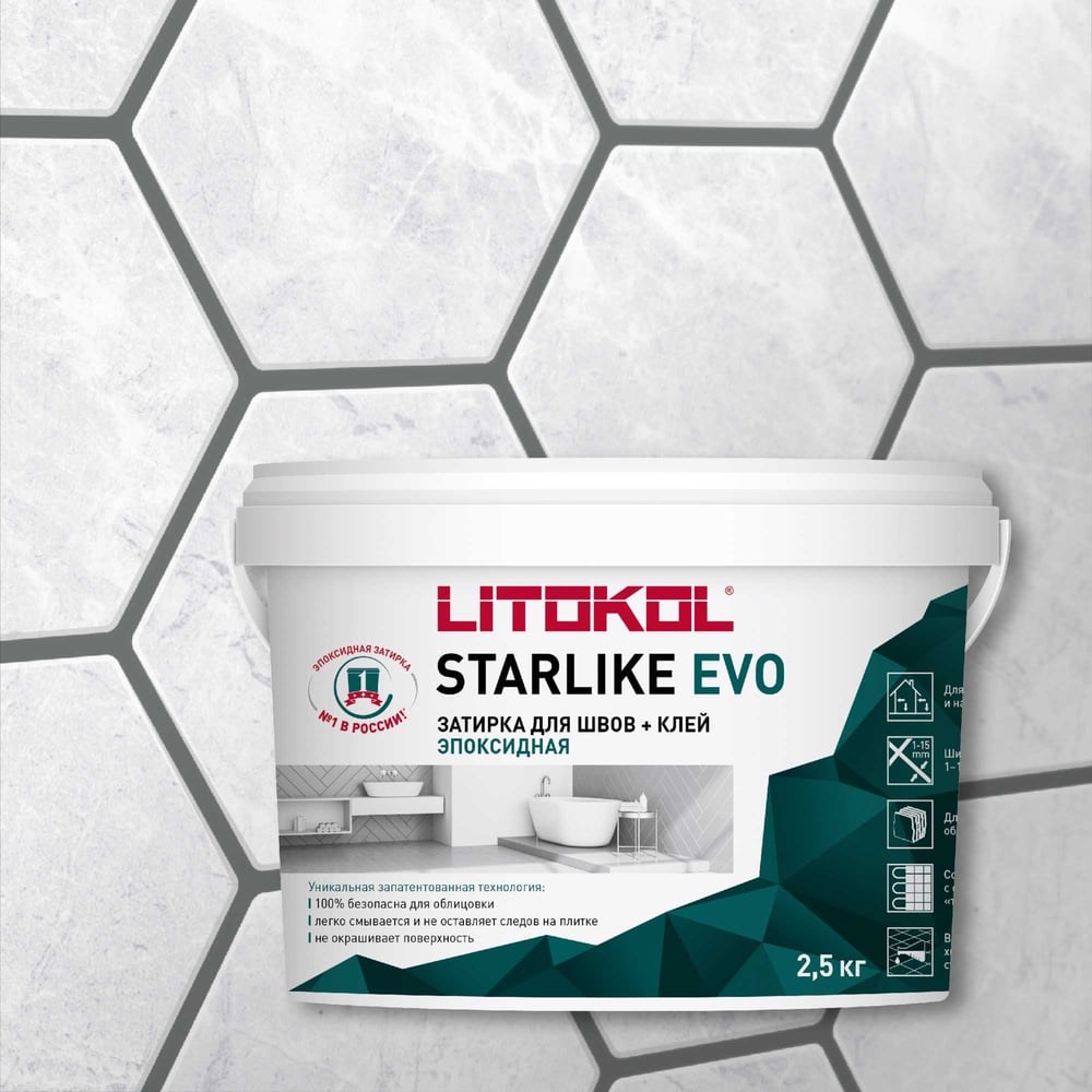 STARLIKE EVO двухкомпонентный эпоксидный кислотостойкий, щелочестойкий состав для затирки межплиточных швов с шириной шва от 1 до 15 мм и использования в качестве клея для всех видов облицовочной плитки и мозаики. Компонент А представляет собой смесь эпоксидной смолы, цветных микросфер и специальных органических добавок. Компонент В — инновационный органический катализатор (отвердитель). После смешивания компонентов А и В получается кремообразный состав удобный в работе. После полной полимеризации обладает непревзойденной гладкостью поверхности шва, высокой стойкостью к механическим воздействиям и превосходной химической стойкостью. Область применения: для внутренних и наружных работ, затирка швов, укладка плитки или мозаики, бассейны, душевые кабины, кухни, ванные комнаты и т.д.