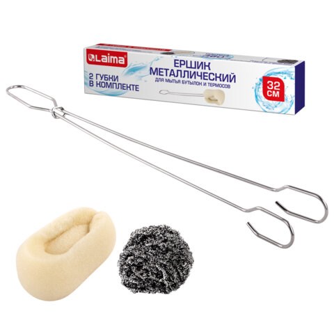 Ершик металлический 32 см кухонный для мытья бутылок и термосов, ДВЕ ГУБКИ в комплекте, LAIMA (ЛАЙМА), 700066