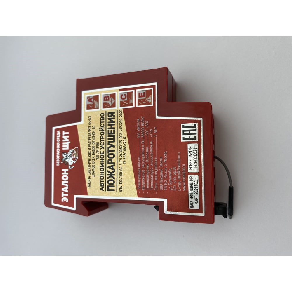 Эталон ООО Торговый дом Пожарный эталон щит-100 D7PE21AU100RE50T - автономное устройство пожаротушения с применением генератора огнетушащего аэрозоля (ГОА). Оснащение электрических щитов УПА исключает вероятность возникновения пожара, от короткого замыкания, перегрева проводки, неисправного автоматического выключателя. УПА - тушит возгорания во всех типах и видах электрических щитов. Срабатывает автоматически при возникновении пожара. Устанавливается на стандартную DIN рейку и сводит к минимуму последствия от возможного возгорания электрического оборудования. По классификации возгорания А2, В, С, Е. Не требует технического обслуживания. Температурный диапазон эксплуатации от -60 C до +60 C. Срок эксплуатации 5 лет;