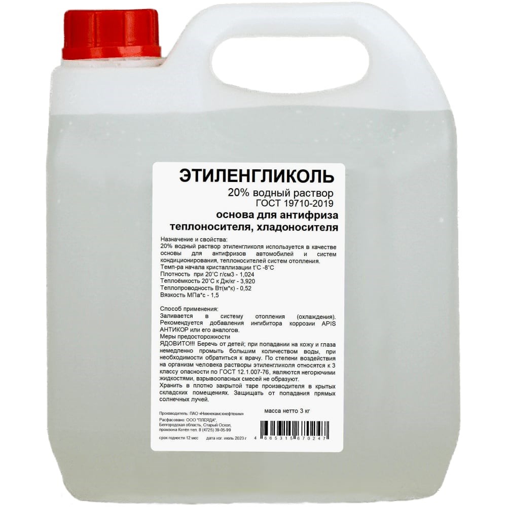 Водные растворы этиленгликоля широко применяются в автономных системах отопления, охлаждения, вентиляции и промышленного кондиционирования в качестве теплохладоносителя. ГОСТ 19710-2019. Температура начала кристаллизации — -8˚С Плотность при 20˚С — 1,024 г/см3 Теплоёмкость 20˚С — 3,920 кДж/кг Теплопроводность — 0,52 Втм*к Вязкость — 1,5 МПа*с