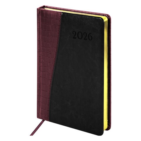 Ежедневник датированный 2026, А5, 138x213 мм, BRAUBERG "Cayman", под кожу, бордовый/черный, 117046