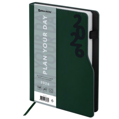 Ежедневник датированный 2026, А5, 150x213 мм, BRAUBERG "Up", под кожу, софт-тач, держатель для ручки, зеленый, 117117