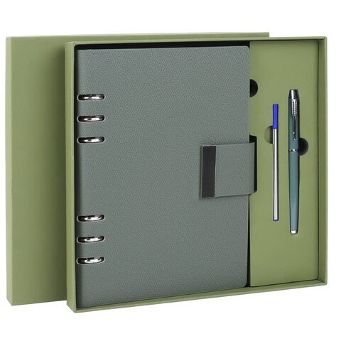 Подарочный набор включает в себя недатированный ежедневник на кольцах с внутренним блоком из 100 листов кремовой бумаги плотностью 70 г/м2. Благодаря классическому формату А5 (165x229 мм) ежедневник удобно использовать как в офисе, так и на выездных деловых встречах. Твердая обложка стилизована под текстурную кожу. Ежедневник фиксируется магнитной застежкой, поэтому не откроется в сумке или портфеле и страницы не помнутся. Также в набор входит ручка со стильным корпусом в тон ежедневника и высококачественными чернилами. Сменный стержень в комплекте позволит дольше наслаждаться мягким письмом. Набор упакован в плотную подарочную картонную коробку. Все элементы набора выполнены в одном цвете.