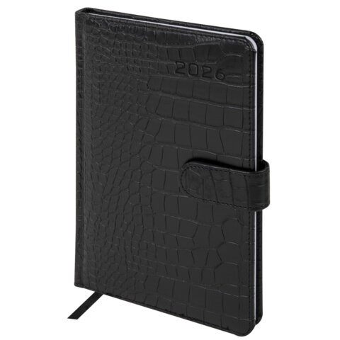 Внутренний блок включает 64 листа белой бумаги плотностью 70 г/м2. Благодаря стандартному формату А5 (145х215 мм) еженедельник удобно использовать как в офисе, так и на выездных деловых встречах. Твердая обложка черного цвета, стилизованная под кожу крокодила, фиксируется магнитной застежкой, поэтому еженедельник не откроется в сумке или портфеле и страницы не помнутся. Подходит для горячего тиснения.