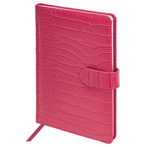 Внутренний блок включает 64 листа белой бумаги плотностью 70 г/м2. Благодаря стандартному формату А5 еженедельник удобно использовать как в офисе, так и на выездных деловых встречах. Твердая обложка, стилизованная под кожу крокодила, фиксируется магнитной застежкой, поэтому еженедельник не откроется в сумке или портфеле и страницы не помнутся. Подходит для горячего тиснения. Дополнением является закладка-ляссе, с помощью которой при необходимости можно быстро открыть еженедельник на нужной странице. Для заметок в еженедельнике имеется 7 страниц в конце внутреннего блока. Еженедельник снабжен обширным справочным материалом. Выполнен в ярком розовом цвете.
