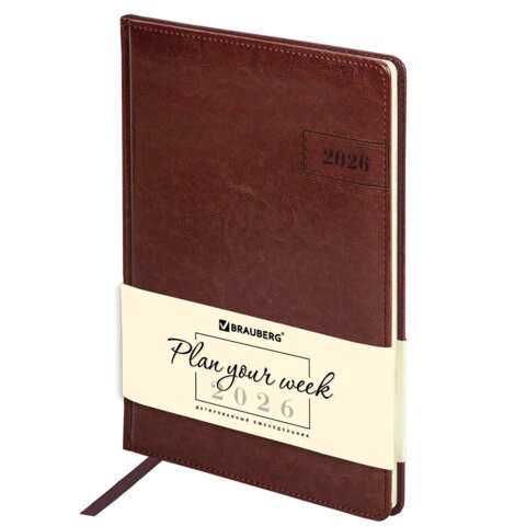 Еженедельник датированный 2026, БОЛЬШОЙ ФОРМАТ 210х297 мм, А4, BRAUBERG "Imperial", под кожу, коричневый, 117156