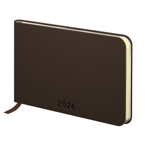 Внутренний блок включает 64 листа тонированной бумаги плотностью 70 г/м2. Благодаря малому формату А6 (105х160 мм) еженедельник удобно использовать как в офисе, так и на выездных деловых встречах. Гибкая обложка темно-коричневого цвета, стилизованная под гладкую кожу, подходит для горячего тиснения.