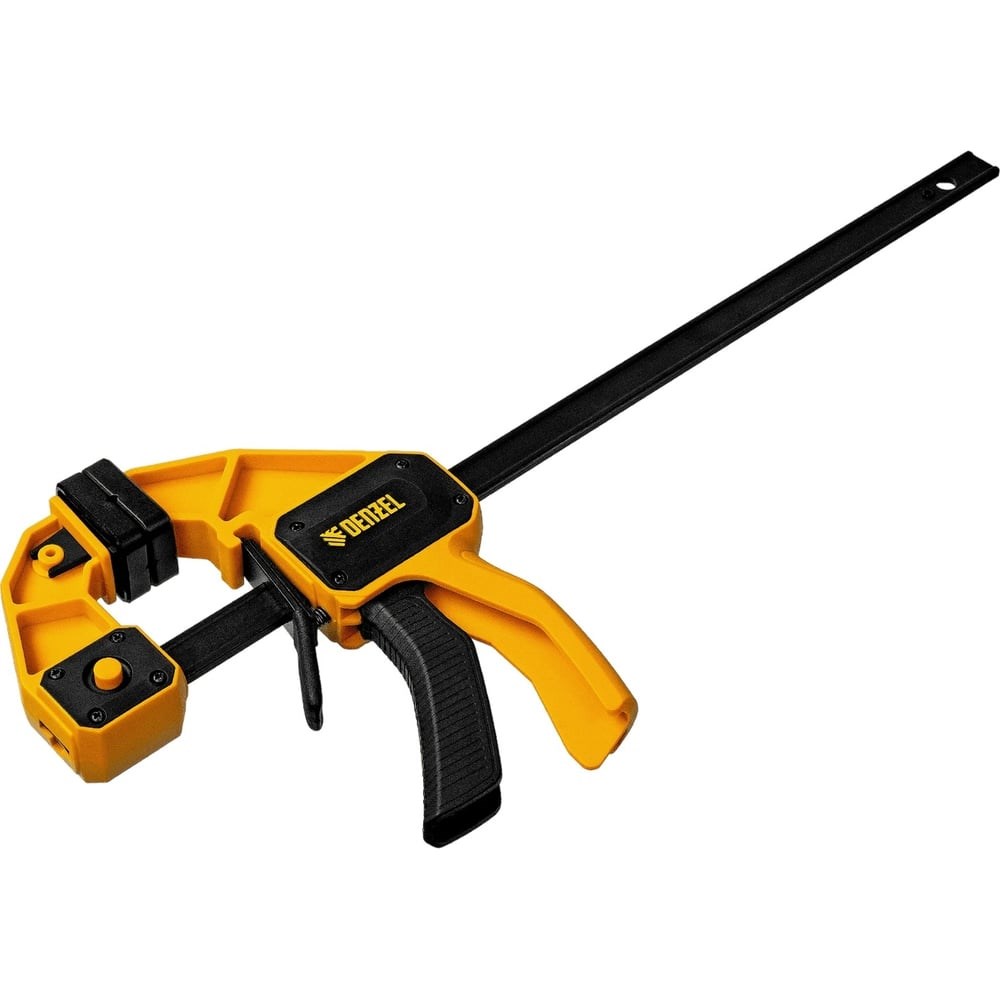 Струбцина F-образная быстрозажимная Denzel 20506 с пошаговым зажимом шириной 300 мм и глубиной 80 мм, с усиленным нейлоновым корпусом, позволяет прочно зафиксировать детали для их обработки, склеивания и выполнения других задач. Сила сжатия составляет 1300 Н. Струбцина подходит для бытового и профессионального применения.