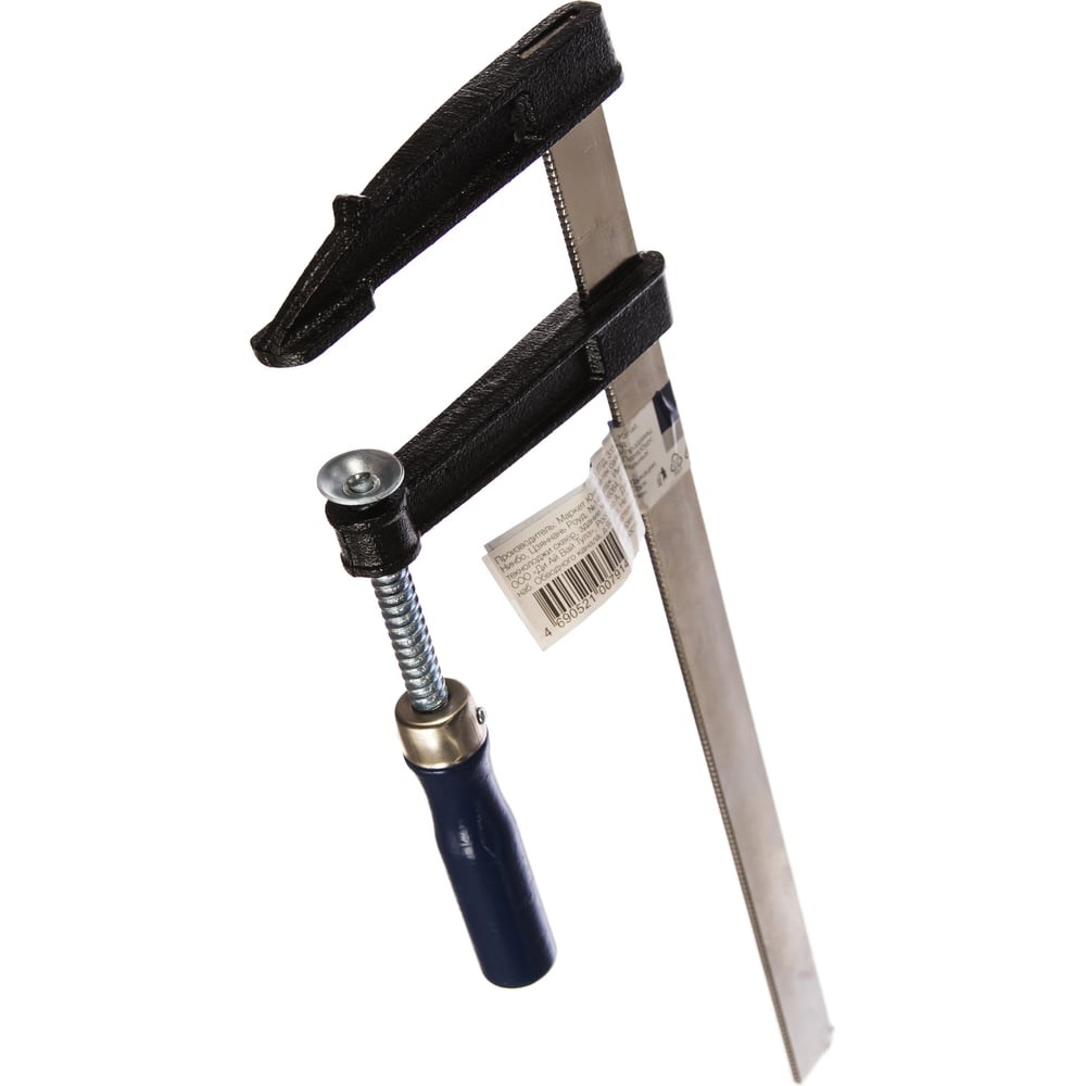 Струбцина F-образные 80х300 мм. Применяется для зажатия и фиксации различных заготовок и деталей при склеивании и других слесарных работах. Зажимное устройство с трапециевидной износостойкой резьбой подвижной части крепко фиксирует детали и легко регулируется. Направляющая шина из качественной инструментальной стали с кованными чугунными губками, ручка из лакированной древесины. Характеристики:Высота зажима (мм): 300Глубина зажима (мм): 80Материал губок: ЧугунМатериал направляющей: СтальМатериал рукоятки: ДревесинаШирина направляющей (мм): 22Толщина направляющей (мм): 3.5Резьба: Т10х3 мм