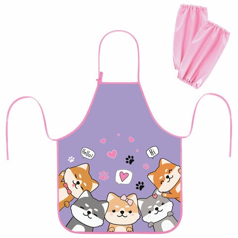 Фартук и нарукавники изготовлены из водоотталкивающего полиэстера. Стандартный размер фартука - 54х46 см, размер нарукавников - 25х12 см. Сверху завязки оснащены металлическим ушком для регулировки фартука по росту ребенка, подходит детям разных возрастов ростом от 117 см. Яркая печать коллекционного дизайна на фартуке. Нарукавники оснащены резинкой с обеих сторон. Фартук и нарукавники помогают защитить одежду ребенка от загрязнений во время занятий трудом и творчеством.