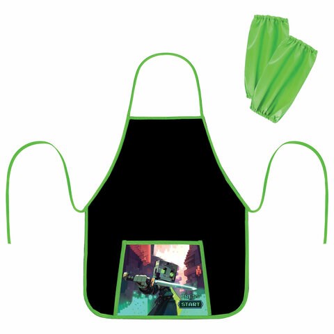 Фартук и нарукавники изготовлены из водоотталкивающего полиэстера. Стандартный размер фартука - 46x54 см, размер нарукавников - 25х12 см. Кроме того, фартук оснащен карманом для канцелярии и прочих принадлежностей, которые всегда должны быть под рукой во время уроков труда и занятий творчеством. Яркая печать коллекционного дизайна на кармане фартука. Нарукавники оснащены резинкой с обеих сторон. Фартук и нарукавники помогают защитить одежду ребенка от загрязнений во время занятий трудом и творчеством.