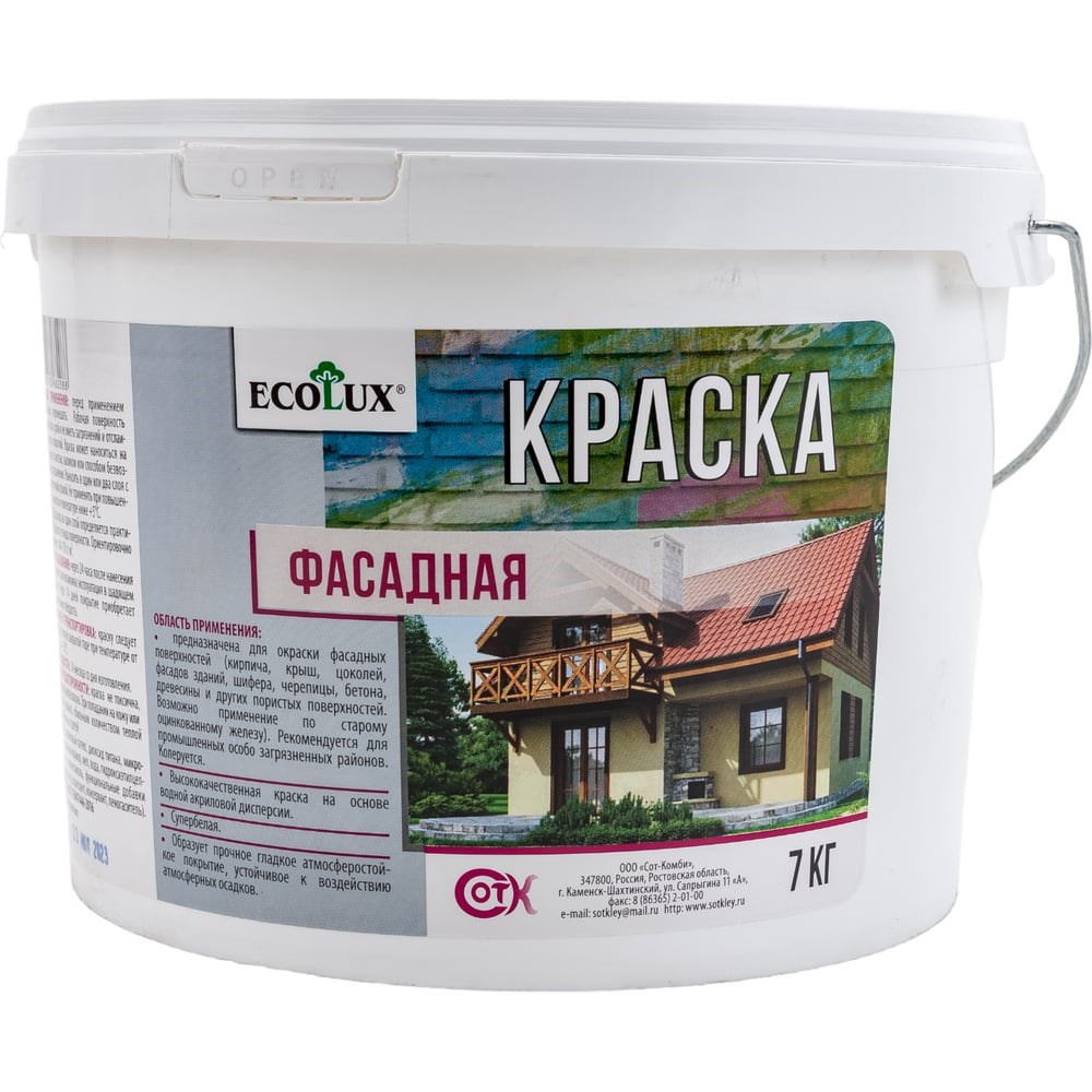Фасадная краска ECOLUX 7 кг 4607133682088 предназначена для окраски фасадных поверхностей кирпича, крыш, цоколей, фасадов зданий, шифера, черепицы, бетона, древесины и других пористых поверхностей. Возможно применение по старому оцинкованному железу. Преимущества: Рекомендуется для промышленных особо загрязненных районов Образует прочное гладкое атмосферостойкое покрытие устойчивое к воздействию атмосферных осадков Колеруется