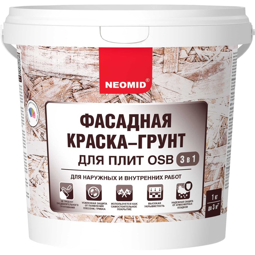 Фасадная краска-грунт для плит OSB NEOMID Proff 3в1, 1 кг Н-ГрунтКраскаOSB-1 предназначена для финишного декоративного окрашивания пенополистирольных и OSB-плит, ДСП, SIP-панелей снаружи помещения. Состав защищает от неблагоприятного воздействия атмосферных осадков, перепадов температуры, повышенной влажности, ультрафиолета, образования грибка, плесени и процессов гниения. Продукт имеет хорошую укрывистость, исключая просвечивание фактуры питы.