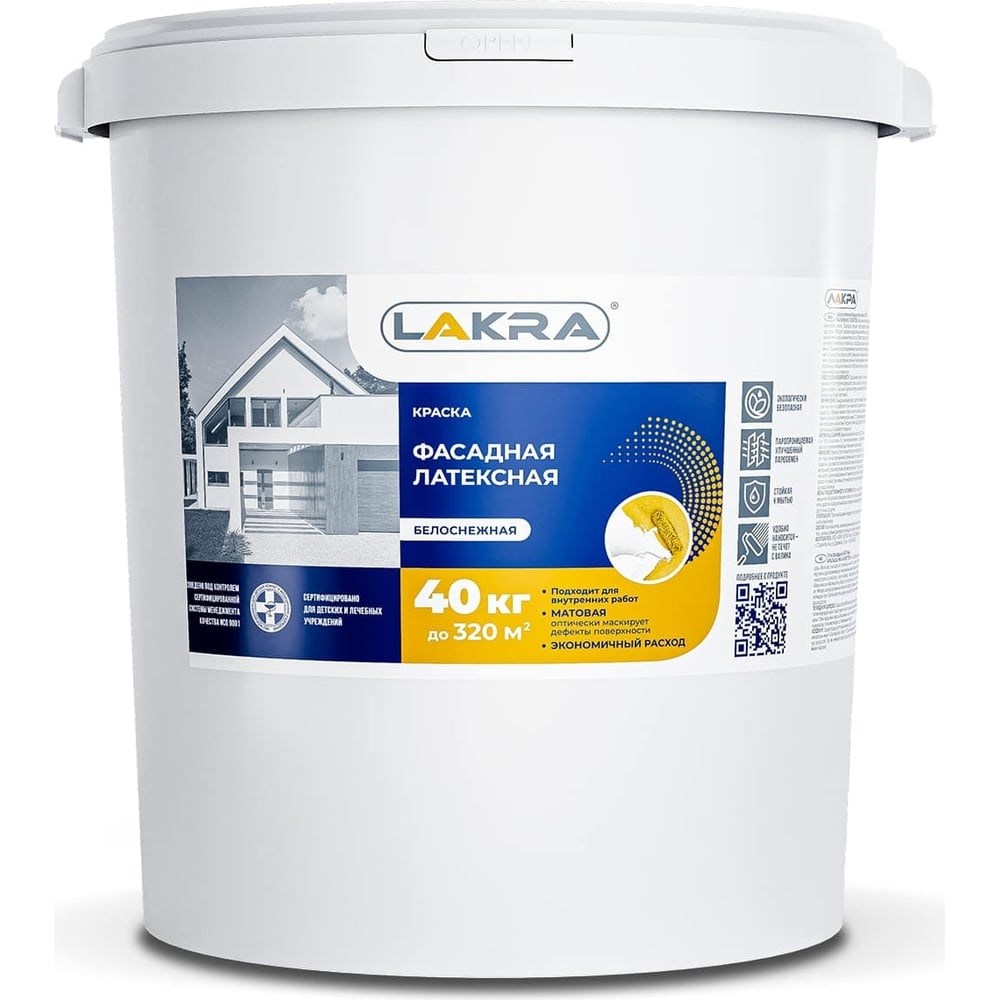 Краска фасадная латексная ЛАКРА белоснежная 40 кг ЛА-00000095 применяется для окраски минеральных поверхностей фасадов зданий и сооружений, а также для внутренних работ в помещениях с интенсивной эксплуатационной нагрузкой – офисы, залы ресторанов, учебные и лечебные заведения, промышленные и административные помещения. Наносится на бетонные, кирпичные, оштукатуренные, и др. пористые минеральные поверхности. Расход при однослойном покрытии 130-150 г/м² в зависимости от впитывающей способности поверхности.