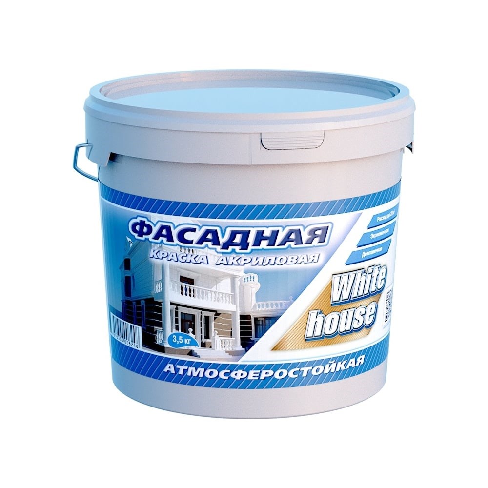 Фасадная краска White House (3.5 кг; морозоустойчивая) 14204 белоснежная акриловая краска для наружных и внутренних работ. Фасадная краска на полимерной акриловой основе устойчива к интенсивным атмосферным воздействиям: УФ-излучениям, сезонным перепадам температур от -40 до +50С, всем видам осадков. Предназначена для защитно-декоративного окрашивания деревянных, кирпичных и бетонных домов, сооружений, помещений с повышенной влажностью воздуха, жилых строений, неотапливаемых промышленных зданий. Водоэмульсионная краска для стен образует покрытие с высокой паропроницаемостью, позволяет поверхности "дышать". В сочетании с акриловым грунтом предотвратит образование грибка и плесени. Краска влагостойкая, поверхность можно мыть с использованием моющих средств. Мойка высокого давления также не окажет вреда покрытию. Краска фасадная WHITE HOUSE легко наносится на различные строительные материалы: штукатурку, шпатлевку, камень, кирпич, асбест, гипс, цемент, различные деревянные основания (доска, вагонка, брус, фанера, МДФ, ДВП, ДСП, OSB, мебельный щит), обои, старые лакокрасочные покрытия.