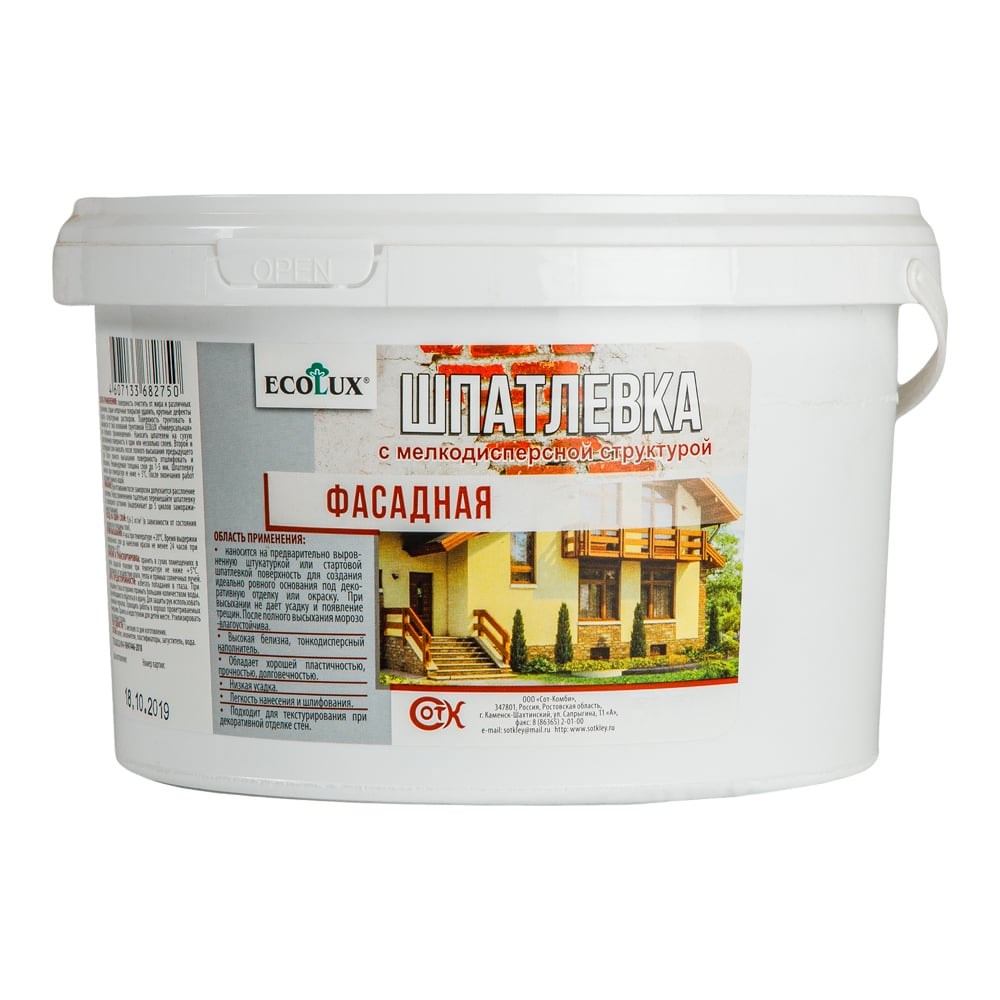 Фасадная шпатлевка ECOLUX 1.5 кг 4607133682750 наносится на предварительно выровненную штукатуркой или стартовой шпатлевкой поверхность для создания идеально ровного основания под декоративную отделку или окраску. При высыхании не дает усадку и появление трещин. После полного высыхания морозо-влагоустойчива. Преимущества: Высокая белизна, тонкодисперсный наполнитель Обладает хорошей пластичностью, прочностью, долговечностью Легкость нанесения и шлифования Подходит для текстурирования при декоративной отделке стен