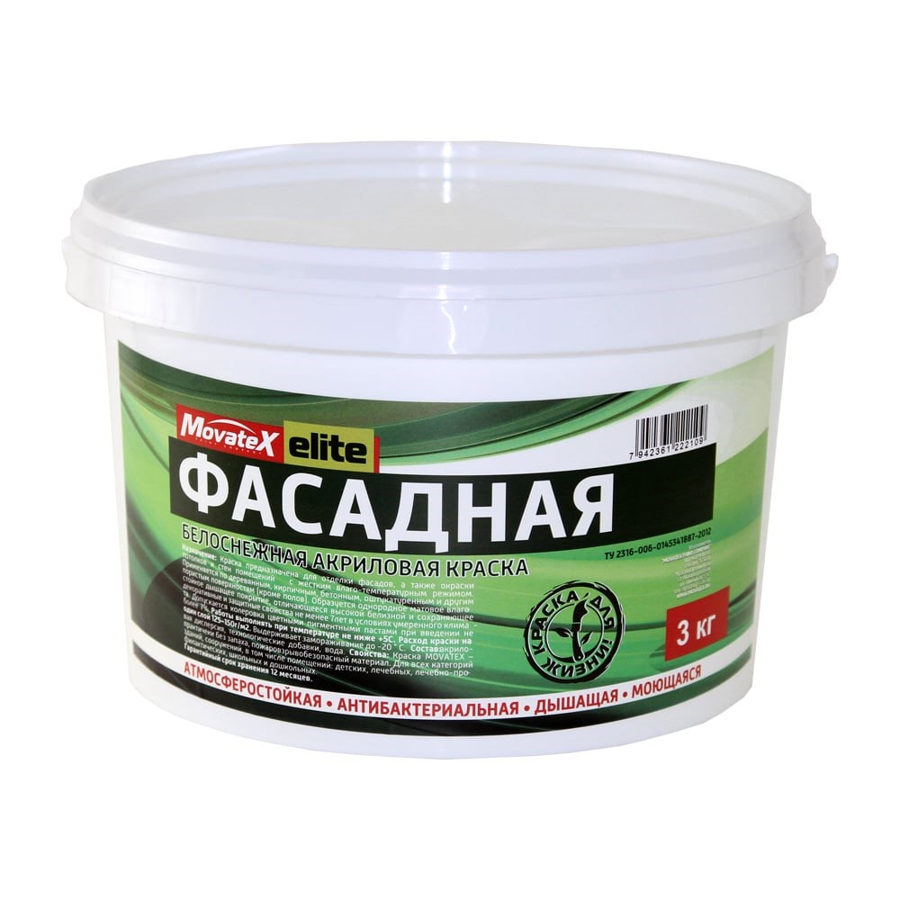 Водоэмульсионная краска Movatex Elite фасадная, 3 кг Т11900 применяется для нанесения на деревянные, кирпичные, бетонные, оштукатуренные поверхности. Атмосферостойкие свойства позволяют использовать продукт для отделки фасадов. Также служит для окраски потолков и стен в помещениях с жестким влаго-температурным режимом. Продукт на акриловой основе образует матовое влагостойкое покрытие. Допускается колеровка цветными пигментными пастами при введении не более 7%. Для получения качественного покрытия рекомендуется предварительная обработка поверхности грунтом "Movatex".