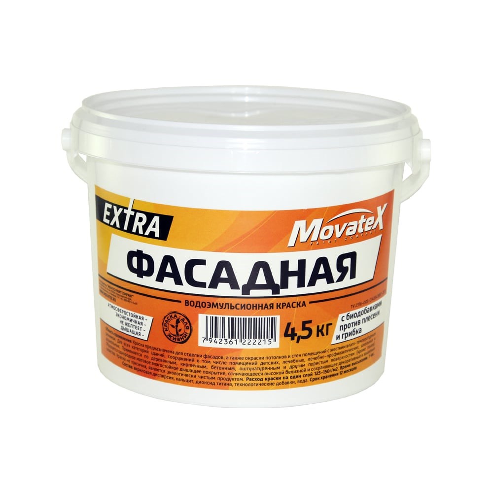 Водоэмульсионная краска Movatex EXTRA фасадная, 4,5 кг Т11933 наносится на деревянные, кирпичные, бетонные, оштукатуренные поверхности. Применяется для наружных и внутренних отделочных работ. Благодаря экологичному и безопасному составу возможно использование продукта в детских и лечебных учреждениях. Продукт создает влагостойкое, дышащее декоративное покрытие.