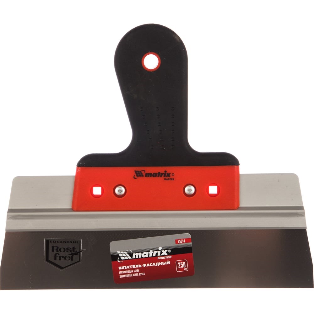 Фасадный шпатель 250 мм MATRIX MASTER 85514 используется для нанесения и разравнивания штукатурных смесей и шпатлевок на большие поверхности. Инструмент удобен в использовании благодаря специальной двухкомпонентной ручке, имеющей изогнутую форму. На рукоятке предусмотрено отверстие - шпатель можно хранить в подвешенном состоянии. Рабочая часть приспособления выполнена из нержавеющей стали.
