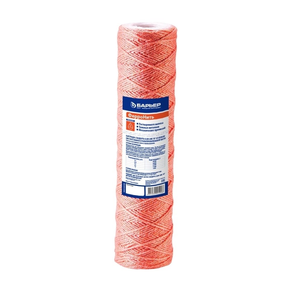 Фильтроэлемент ФерроНить 10 мкм Барьер применяется в фильтрах Барьер для очистки холодной водопроводной воды из центральных источников водоснабжения с высоким содержанием окисленного железа. Обеспечивает эффективную очистку воды от растворенного железа, ржавчины, песка, окалины и других механических частиц при концентрации до 2 ПДК. Картридж задерживает примеси железа посредством каталитического окисления и последующей механической очистки. Стандарт картриджа - Slim Line 10".