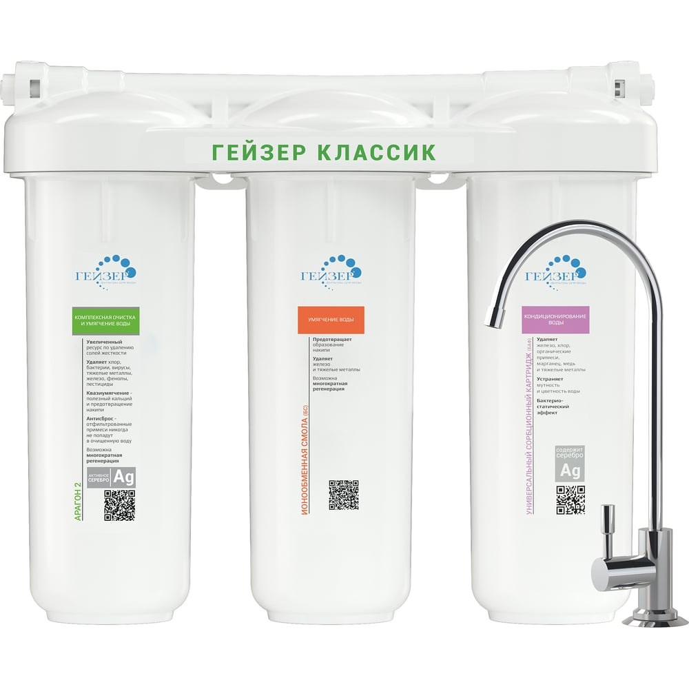 Гейзер Классик для комплексной очистки воды устанавливается под мойку с выводом отдельного крана чистой воды. Фильтр умягчает воду, удаляет хлор и хлорорганические примеси, снижает содержание железа и тяжелых металлов. Температура очищаемой воды должна быть не более 40 градусов.Ступени очистки:Арагон 2 Тонкая очистка, увеличенный ресурс по удалению солей жесткости. Ресурс 7000 л.БС - 10SL Умягчение воды. Простая регенерация поваренной солью. Средний ресурс до регенерации 500 л. при содержании солей жесткости до 3 мг-экв/л.БАФ Финишная очистка воды. Ресурс до 12000 л.Характеристики:Габаритные размеры корпуса водоочистителя в сборе не более, мм. 390x295x110 Рекомендуемая скорость фильтрации не более 3 л/мин Рабочее давление не менее 0,5 атм. Температура воды не более 40 °С Масса без упаковки не более 6,5 кг Гарантия - 3 годаСрок эксплуатации - 10 летТребования к качеству исходной воды Тип воды жесткая, сверхжесткая Минимальная жесткость воды, Ж°, от: 3 Максимальная жесткость воды, Ж°, до: 3.9 Железо, до, мг/л: 1 ПМО, до, мг/л: 5