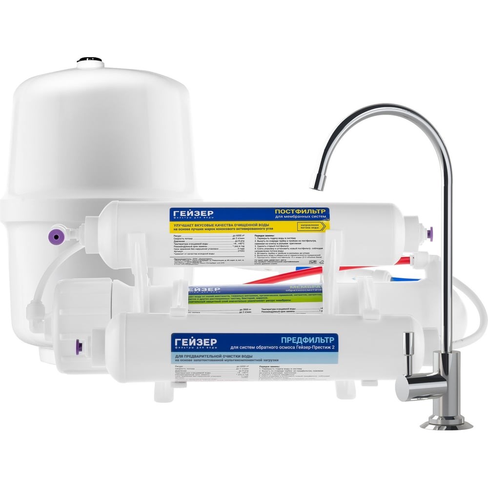 Система обратного осмоса Гейзер Престиж-2 с накопительным баком 12л 20042 способен очищать воду до питьевого уровня. Система поставляется с баком на 12 литров для хранения воды. Обратноосматическая мембрана удаляет из воды бактерии и вирусы.