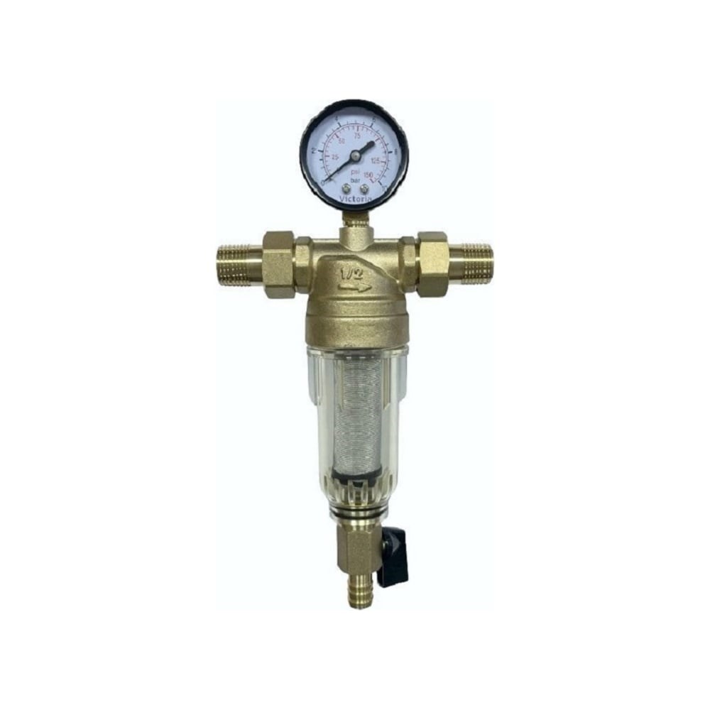 Промывной фильтр с манометром для холодной воды Victoria 3/4" (тонкая очистка) с американками 27-703