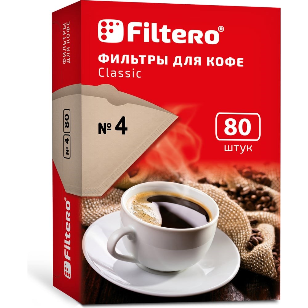 Фильтры для кофе, №4, 80 шт, корич Filteroиспользуются с кофемашинами капельного типадля очистки жидкости от мелких частиц молотого кофе. При этом вкус и цвет напитка не меняются.80 фильтров в одной упаковке Натуральные неотбеленные фильтрыБумажные одноразовые фильтры Filtero для кофеварок капельного типа, пуроверов, калита, кемексРазмер №4 соответствует стандарту «1х4» для кофеварок на 8-12 чашек.Экологически чистый продукт. Прочный шов выполнен без применения клея.