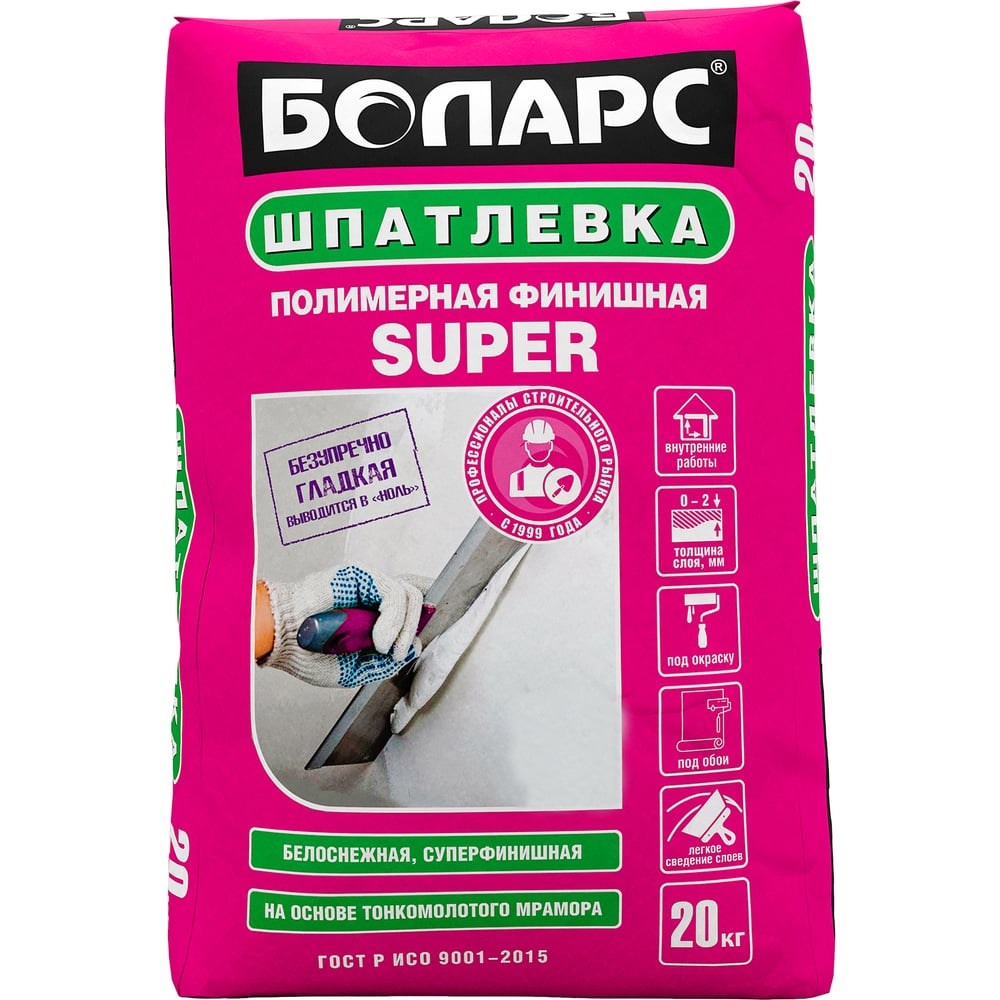 Финишная шпатлевка БОЛАРС SUPER 2100 20 кг 00000007465 предназначена для финишного тонкослойного (от 0 до 2 мм за один слой) выравнивания стен и потолков, для их подготовки к последующей высококачественной окраске или оклейке обоями. Для получения более толстого слоя допускается шпатлевание в несколько слоев. После высыхания шпатлевка образует белоснежную, плотную, шелковистую, не мелящуюся поверхность. Обладает высокой паропроницаемостью, что дает возможность поверхности "дышать", создавая благоприятный микроклимат в помещении. Наносится ручным способом на оштукатуренные кирпичные, бетонные, пено- и газобетонные, гипсовые, цементно-песчаные, цементно-известковые основания, а также на неоштукатуренные - ГКЛ, ГВЛ, ЦСП и ПГП. Изготовлена на основе тонкомолотой мраморной муки и модифицирующих добавок. Предназначена для внутренних работ в помещениях с нормальной влажностью. Жизнеспособность: 72 часа в закрытой таре.