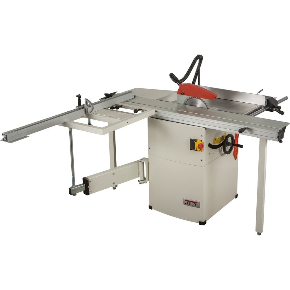 Циркулярная пилаJet JTS-600XL– уникальный по сочетанию характеристик и стоимости станок. Уже в базовый комплект поставки входит подвижный стол (каретка) и расширение к нему. Расширитель укомплектован регулируемой телескопической опорой и торцевым упором заготовки. Торцевой упор выполнен поворотным, что позволяет делать распилы под точно установленным углом. Для фиксации заготовки можно использовать регулируемый концевой ограничитель; в случае ненадобности он откидывается. Основа конструкции пилы – металлическая тумба, внутри которой установлены асинхронный трехфазный двигатель, механизмы регулировки по высоте и углу наклона пильного модуля (он выполнен из чугунной отливки) и пылесборный кожух со 100-миллиметровым патрубком подключения к вытяжной установке. Рабочий стол чугунный, вдоль него проходит жесткая цилиндрическая направляющая, по которой перемещается параллельный упор с эксцентриковой фиксацией – эти решения полностью соответствуют профессиональному стандарту. Рабочая поверхность может быть увеличена за счет установки расширителя и удлинителя, сделанных из листовой стали – они штатно поставляются вместе с пилой. С учетом предельной (1600 мм) длины распиловки на подвижном столе и относительно небольшой массы станка можно рекомендовать его для любительской и профессиональной работы с некрупными мебельными панелями из ДСП и клееного щита, а работу с тяжелыми заготовками из массива плотной древесины ограничить на уровне эпизодического использования.