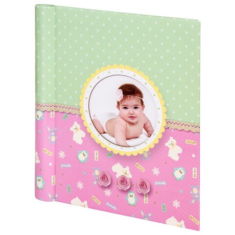 Состоит из 20 магнитных листов размером 23х28 см, что позволяет комбинировать и размещать до 120 фотографий различных форматов: 18х24 см, 10х15 см, 13х18 см. Обложка фотоальбома выполнена в детском дизайне в салатовом и розовом тонах и декорирована фоторамкой, фотография в которой может быть заменена по желанию владельца. Способ крепления страниц - спираль. Размер альбома - 25х29 см. Диаметр окошка под фото на обложке - 10,5 см.