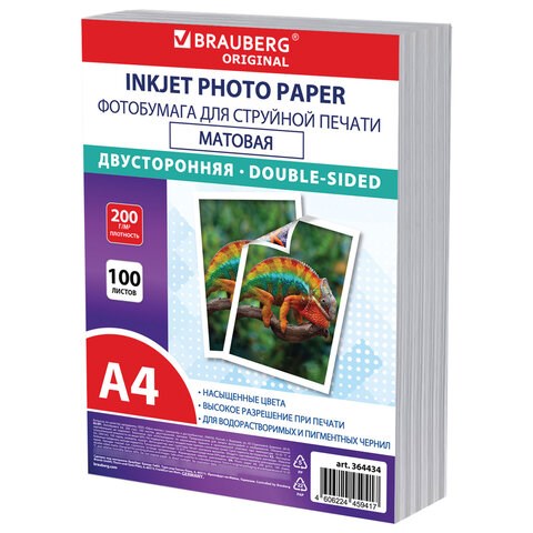 Фотобумага матовая, А4, 200 г/м2, двусторонняя, 100 листов, ПАКЕТ, BRAUBERG ORIGINAL, 364434